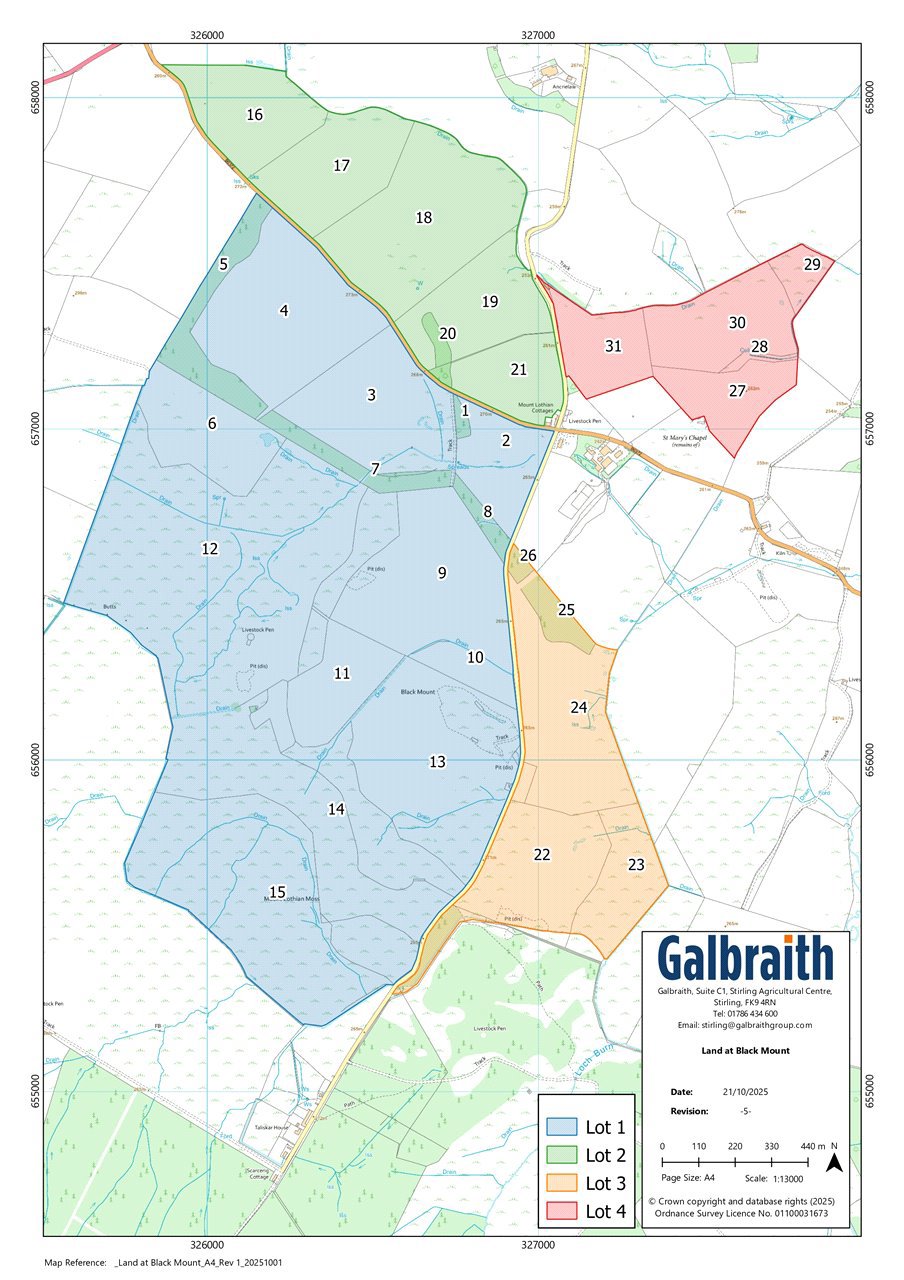 SITUATIONThe Land at Black Mount is situated in a scenic and accessible rural location within Midlothian, close to the settlement of Howgate and 3.5 miles to the southeast of the popular town of Penicuik. The land benefits from direct access onto adjacent public roads and is only 7.5 miles south of the Edinburgh City Bypass, offering excellent transport links to both the north and south of the country. Penicuik provides a range of day-to-day amenities including a variety of retail and business services, and primary and secondary schools. The large retail and industrial park at Straiton, which is located about 7 miles to the north, offers a wide selection of services and major retailers including IKEA and Costco.The nearby train station at Gorebridge, around 7 miles from the property, provides fast rail connections to Edinburgh and beyond. The City of Edinburgh offers a broader range of services, including financial centres, retail and business facilities, and regular mainline railway connections, international airport services are available from Edinburgh Airport.This part of Midlothian is renowned for its high-quality mixed farming units, and the Land at Black Mount offers a mix of fertile soils capable of producing good yields across a variety of arable crops and areas of pasture and grazing land well suited to the rearing of livestock. The area is well served by a range of agricultural merchants and suppliers, with several agricultural contractors available to provide additional farming resources if required. The excellent road network provides easy access to a number of livestock markets located in Lanark, Stirling and St Boswells offering a choice of outlets for livestock purchases and sales.DESCRIPTIONThe Land at Black Mount offers a versatile block of mixed arable and livestock farmland extending to approximately 346.32 Ha (855.76 Acres) in total and is located within a highly accessible location within rural Midlothian. The land is split into four separate blocks by the B6372 and the minor public road which leads south from the A6094 and Rosslynlee Trout Fishery, and comprises a productive mix of arable, pasture and grazing ground with a number of areas of woodland providing shelter and amenity to the holding. The land benefits from direct access onto adjacent public roads, which link onto the A701 to the west or the A7 to the east. The land has been principally classified as Grade 4 and 5 by The James Hutton Institute with some smaller areas of Grade 3 and is of a varying aspect rising overall from 253m to 280m above sea level. The arable land has historically been farmed on a mixed arable operation, with cereals and temporary grass all grown as part of the rotation.METHOD OF SALEThe Land at Black Mount is offered for sale as a whole or in 4 lots.LOT 2: ABOUT 57.27 HA (142.66 ACRES)The land within Lot 2 comprises a productive block of farmland which extends in total to about 57.27 Ha (142.66 Acres) and is located to the northeast of the B6372 and is bound to the east by the minor public road which leads to Rosslynlee Trout Fishery and the A6094. The land predominantly comprises a productive mix of arable and silage ground with smaller areas of pasture and broadleaved woodland. The land is generally of a southeasterly aspect and rises from 253m on the northeastern boundary to 273m above sea level at its highest point adjacent to public road. The land has been classified by The James Hutton Institute as a mix of grade 3.2, 4.1, and 4.2 and the enclosures are all laid out in a good size and well suited to use of modern machinery with direct access available from the B6372 public road. The grazing fields benefitting from access to natural source water supplies.FORESTRY GRANT SCHEME / RE-STOCK PLANTING OBLIGATIONS / TIMBER RIGHTSAll remaining standing timber is included in the sale as so far as it is owned by the seller.IACSAll the farmland is registered for IACS purposes.NITRATE VULNERABLE ZONE (NVZ)The Land at Black Mount is not included within a Nitrate Vulnerable Zone.BASIC PAYMENT SCHEME ENTITLEMENTS (BPSE)There are no Basic Payment Scheme Entitlements available with the Land at Black Mount.LESS-FAVOURED AREA SUPPORT SCHEME (LFASS)All of the land has been designated as being within a Less-Favoured Area.LOCAL AUTHORITYMidlothian Council, Midlothian House, 40-60 Buccleuch Street, Dalkeith, EH22 1DNSCOTTISH GOVERNMENT RURAL PAYMENTS AND INSPECTIONS DIRECTORATEGALASHIELSCotgreen Road, Tweedbank, Galashiels, TD1 3SGTel: 0300 2441400SGRPID.galashiels@gov.scotINGOING VALUATIONThe purchaser(s) of Land at Black Mount shall, in addition to the purchase price, be obliged to take over and pay for at a valuation to be agreed by a mutually appointed valuer(s) with respect to the following:1. All cultivations and growing crops on a seeds, labour, lime, fertiliser, sprays and machinery basis with an increment representing the enhanced value of the establishment and age of such crops.2. All feed stuffs, hay, straw, fodder, roots, silage and farmyard manure and other produce at market value.3. All oils, fuel, fertilisers, sprays, chemicals, seeds, and sundries at cost.Note: If the amount of the valuations has not been agreed on the date fixed for completion, then the purchaser shall pay to the seller such a sum as selling agents shall certify on account at the valuation pending agreement. Should the payment not be made within seven days then the interest will become payable on outstanding monies at 8% over Bank of Scotland borrowing rate.VIEWINGStrictly by appointment with the Selling Agents.POST CODEEH26 8QQWHAT3WORDSTo find this property location to within 3 metres, download and use What3Words and enter the following 3 words:Lot 2: https://what3words.com/parsnip.burying.sometimesHEALTH & SAFETYThe property is an agricultural holding, and appropriate caution should be exercised at all times during inspection particularly in reference to the farm buildings, farmland and water courses.SOLICITORSTu