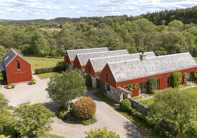 A double award winning, Norwegian inspired house in glorious grounds. Beautifully proportioned and presented, single storey accommodation. Imaginatively designed grounds with drawbridge over the Aultgowrie burn and beautiful formal gardens. Fully restored barn available by separate negotiation.
