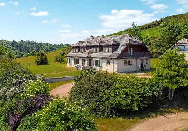 A modern country house in a peaceful setting with spectacular views over the Moray Firth. Garage with workshop and games room above. About 4.52 acres.