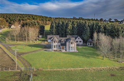 Bespoke 4 bedroom detached country home with panoramic Bennachie Hill views. Around 24 acres in total, including garden grounds, grass field, woodland and two expansive detached garages.