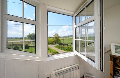A charming house in a peaceful, rural location. Spectacular views to the south across open farmland and woodlands. Flexible, bright and airy accommodation.